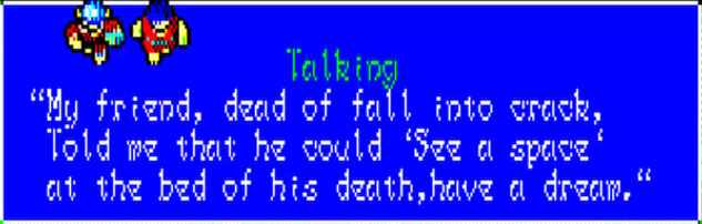 Someone in the game (in the second village that you can only find by having an intelligence level high enough to be able to read the tombstone in a graveyard that hides the entrance (dream logic!)) tells me the above. Since I have explored the overworld a bit, I have noticed that there is a giant crack in the ground, and it looks like maybe stars inside it, and this is meant to confirm it. In the Super Hydlide translation, this person tells you that when their friend fell into the crack, he told them he could see outer space just before he died. The Hydlide 3 The Space Memories version is so much more poetic, if also more cryptic.